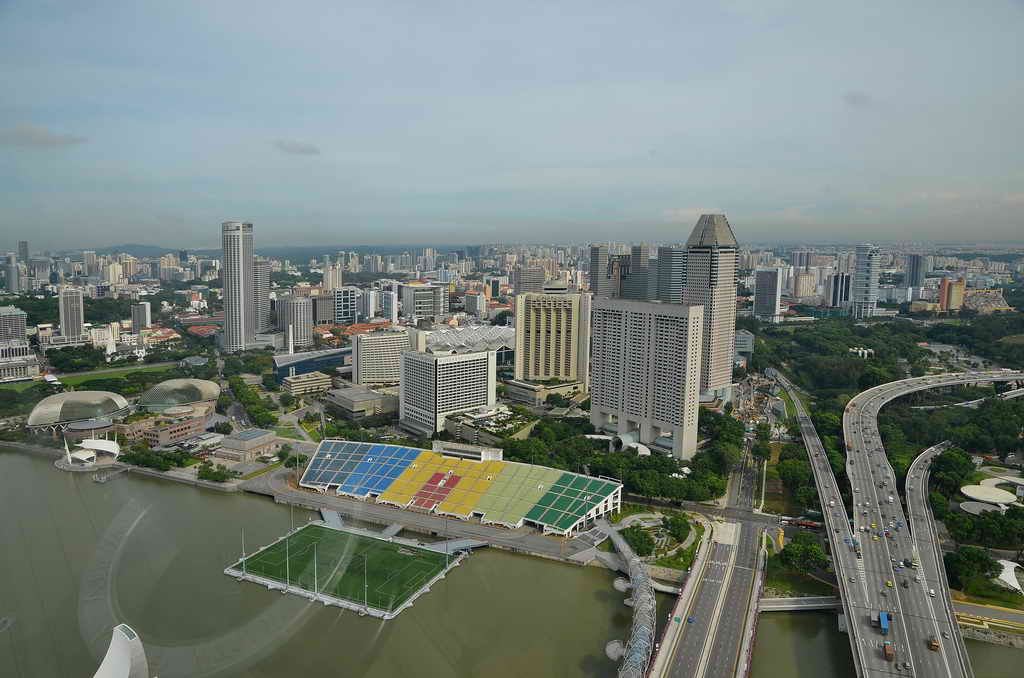 von dort war es nicht weit zum neuen Bay Sands Hotel, Casino, Messe und Shoppingcenter (das mit dem Infinitypool auf der großen Dachterrasse, die sich über die 3 Gebäudetürme erstreckt. Ich besichtigte das Ganze, fuhr auch nach oben auf die Plattform, aber leider ist der Poolbereich nicht mehr zugänglich, sondern nur noch das Aussichtsdeck. Der Blick war trotzdem grandios.