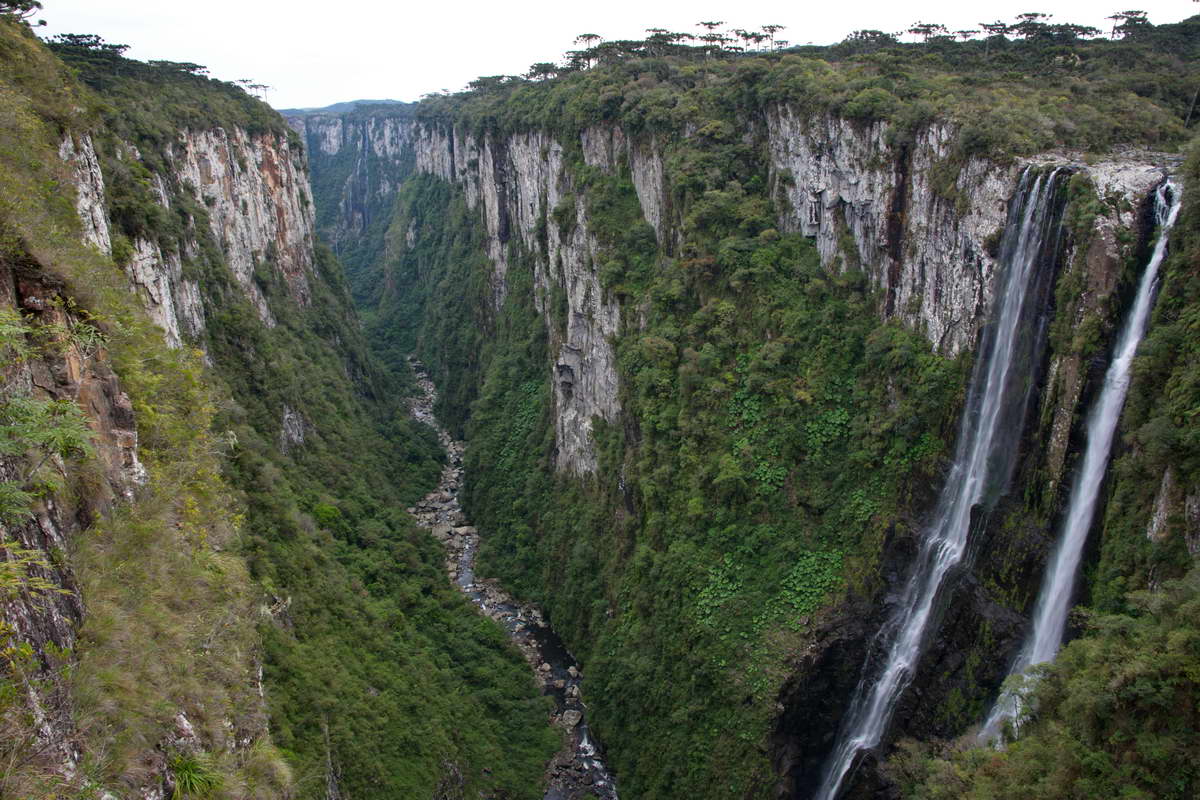 In der Früh erwache ich bei Regen. Na Super, ich will heute in den anderen Nationalpark fahren, und mir den Canyon Fortaleza anschauen. Der liegt im Parque National da Serra Geral und ist der größte von den dutzenden Canyons hier. Er ist bis 900 m tief, bis 2 Km breit und 9 Km lang.