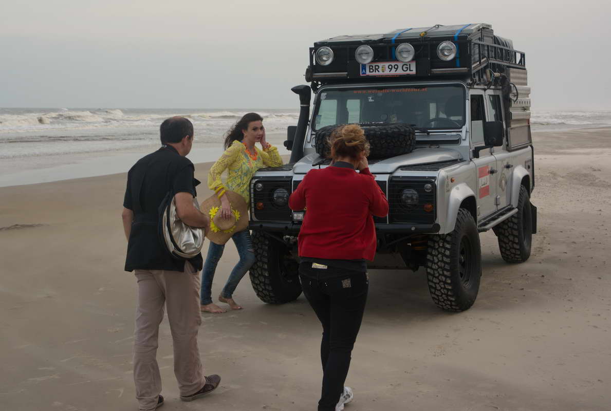 Ich fahre über Tramadai und Canao do Canoa nach Torres. Das Seebad ist nach 3 großen Basaltfelsen benannt, die aus dem Strand herausragen. Ich fahre erst in die Stadt, da ich den Campingplatz schon im Vorbeifahren lokalisiert habe und bringe erst mal Wäsche zum Waschen.  Dann schau ich mir die Stadt an und mache einen Abstecher an den Strand. Am Strand da Guarita  sind die Wellen hoch und die Surfer zahlreich. Dort angekommen muss ich erst mal einen Jüngling aus dem Strand ziehen,  dessen Räder solange durchgedreht haben, dass das Auto mit dem Bodenblech aufliegt. Ich bin ja nett.  100 m weiter- ich bin gerade ausgestiegen – kommt ein Mann mit großer Kamera auf mich zu. Er spricht natürlich portugiesisch und ich versteh nur Foto, Foto. Ich dachte er will ein Foto von meinem Auto machen. Ich sage Ja und eine Minute später kommt eine ganze Crew mit dem Model ums Eck und benutzt meinen Landy als Fotomotiv für ihr Shooting.