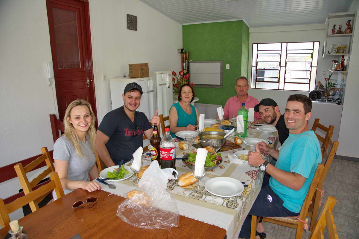 Sie sprechen kein Englisch, ich verstehe nur Teile, und muss mein ganzes Spanisch aufbieten- das sie aber ganz gut verstehen. Ich soll natürlich zum Abendessen reinkommen. Reis, schwarze Bohnen – das gibt’s in Brasilien hier jeden Tag, dazu ein paar Nudeln, Würste und ein Auflauf. Teigig, batzig aber gut.