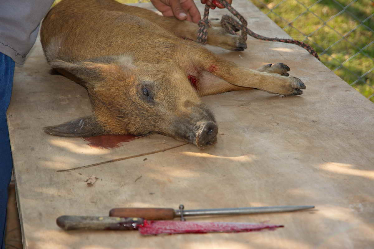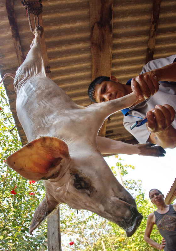 David – Noemies Freund, ein Paraguayer schlachtet und präpariert das Schwein für uns. Er arbeitet regelmäßig als Schlachter. Seine Handgriffe sind gekonnt und schnell. Ein kurzer Stich in die Halsschlagader und in ein paar Sekunden ist es vorbei. Der große Vorteil hierbei ist, dass das Schwein mit den letzten Herzschlägen das ganze Blut herauspumpt und das Fleisch so perfekt ausgeblutet ist. Nur mit heißem Wasser, das er punktuell über die Borsten schüttet und einem Löffel schabt er die obere Haut mit den Borsten ab, die Feinarbeit erledigt er mit einem Einwegrasierer.