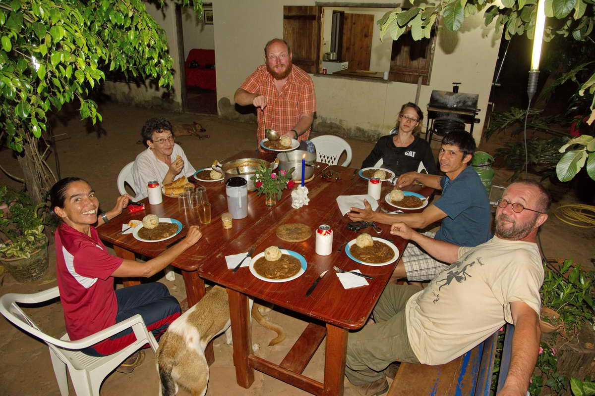 Zurück im Stall grillen wir eine Schweinekeule, die in rustikaler paraguayischer Art, einfach um den Tisch gestanden wird und jeder schneidet mit dem Messer das Fleisch vom Knochen. Das besondere dabei ist, das das Fleisch komplett ungewürzt gegrillt wird, maximal Salz auf das abgeschnittene, zum Verzehr genommene Stück Fleisch gestreut wird.