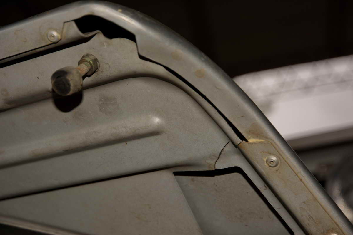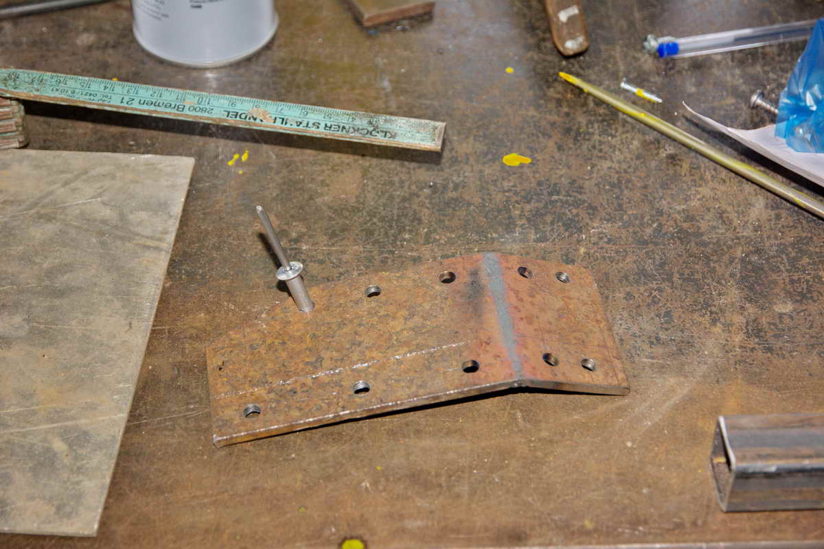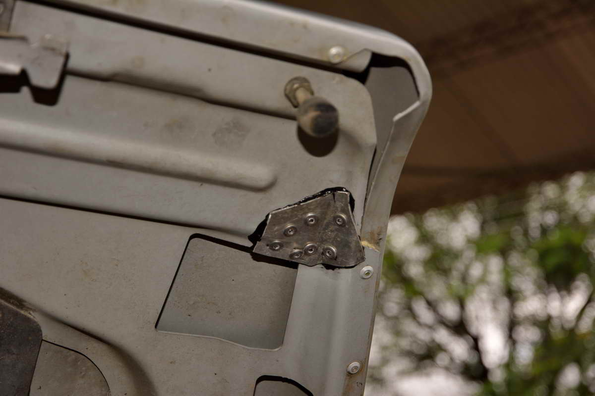 Sie biegen einige dicke Flacheisen und suchen eine alternative Befestigung. Und das innere Blech in der Motorhabe ist warum auch immer gerissen. Das hat er ebenfalls repariert.