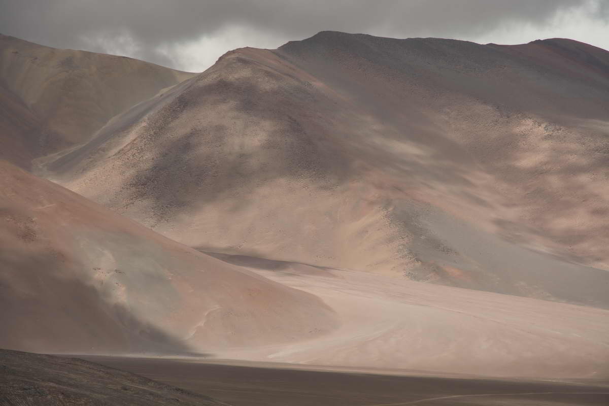 Ich hielt mich an seine Tipps und wir kamen unbeschadet über die Passhöhe (4350 m). Gigantische Ausblicke eröffneten sich, Bunte Berge voraus und schöne Dünen unter uns. Nach dieser Passhöhe kam nochmal eine Kreuzung, hier verfuhren wir uns. Wieder mal interessant, das diese, sehr selten befahrene Piste überhaupt im Navi verzeichnet ist. Hier sagte uns das Navi, das wir links fahren sollten, wir folgten der zugewehten Spur und mein Spürsinn hatte nach einiger Zeit das Gefühl, das wir hier falsch sind, da hier schon wirklich lange niemand mehr gefahren sein konnte. Trotzdem folgte ich der Strecke noch ein paar Kilometer. Dabei blieben wir einmal fast stecken und einmal war ich sehr nervös, ob das ausgetrocknete Flussbett, das zu durchfahren war, wirklich fest und trocken sei oder ob die zugewehte Oberfläche unterhalb eine Überraschung für uns bereit hielt- Na zumindest bräuchte ich dann nicht alle zu schaufeln dachte ich mir. Manchmal ist es halt doch von Vorteil, mal jemanden dabei zu haben.
