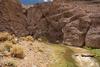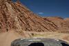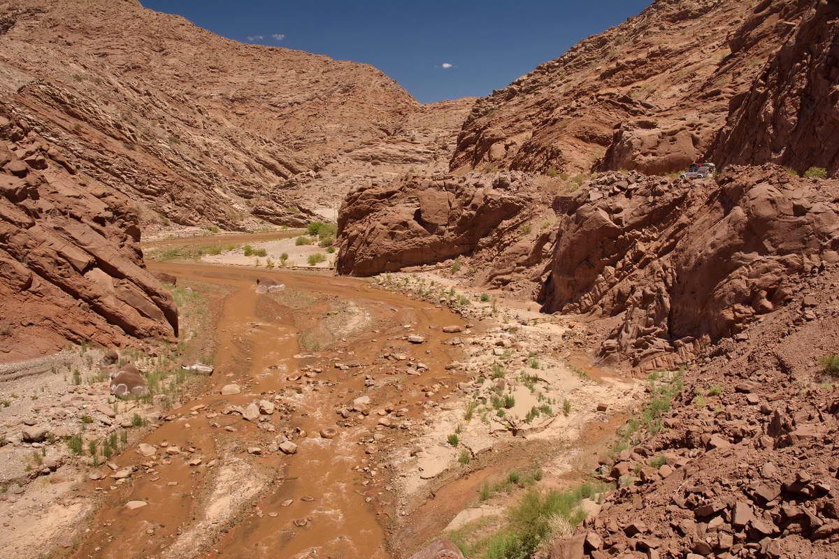 Als wir an der nächsten Bergkette ankamen, konnten wir die Piste nur mehr erahnen und als unsere Augen dem schmalen Strich folgte, der sich mehr und mehr in großen Sanddünen auflöste, war uns klar, das hier Endstation ist. Wir drehten um und fuhren zur Kreuzung zurück. Der folgende Streckenabschnitt war im Navi nicht vorhanden und so waren wir gespannt, wo uns die Spuren schließlich hinführen würden. Die Piste umfuhr einen Gebirgsstock auf der anderen Seite und traf weit später wieder auf den ursprünglichen Weg. Aber zuerst erwartete uns eine grandiose Abfahrt, die im Tal in einem Bach endete. Erst waren wir unschlüssig, aber da es keine andere Alternative gab, musste der Bach der Weg sein. Ich fuhr in den Bach und folgte ihm um die Kurve bis wir sahen, dass die Spuren weiter hinten einen Hügel hinaufführten. Das Spiel wiederholte sich sicher 20 Mal. Kein Problem, das Wasser war nicht tief und der Boden bestand aus großen Kieselsteinen. Bei Hochwasser ist dieser Weg sicher erschwert oder nicht passierbar, je nach Wasserstand. Einer der schönsten Strecken die ich in Nordargentinien gefahren bin. Empfehlung.