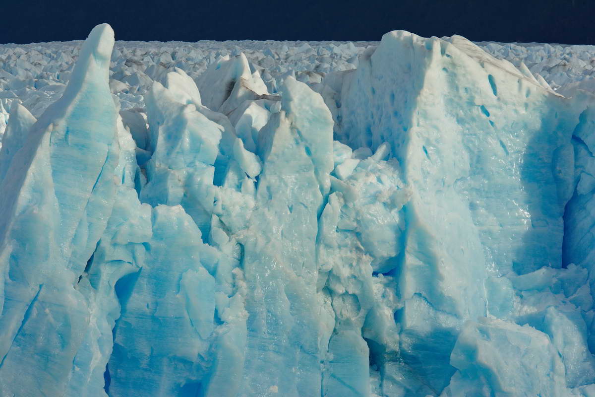 Gegenüberliegend fließt der Spegazzini Gletscher in den See, er besitzt eine gänzlich andere Charakteristik. Ist ebenfalls stabil und er ist schmaler. Er fließt sehr steil herunter vom Berg und die Abbruchfront ist die höchste aller Gletscher im patagonischen Eisfeld. Das Eis erhebt sich bis zu 135 Meter aus dem Wasser. Der Wettergott war uns wirklich hold, kein Wind, wenig Wolken.