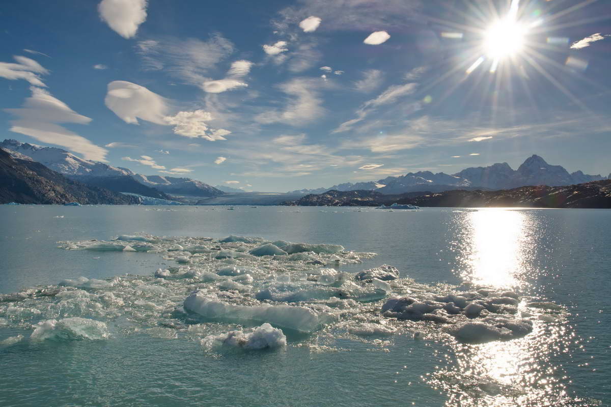 Das südpatagonische Eisfeld im Ganzen leidet auch unter dem Klimawandel. Innerhalb der letzen 66 Jahr verkelinerte sich die Eisfläche um etwa 1000km2 auf jetzt 12000 km2. Ungefähr 8 Meter Schnee fällt im Jahr im Wachstumsgebiet des Eisfeldes auf über 2000 Meter höhe. 10 Jahre dauert es, bis sich der Schnee zu Eis verpresst.