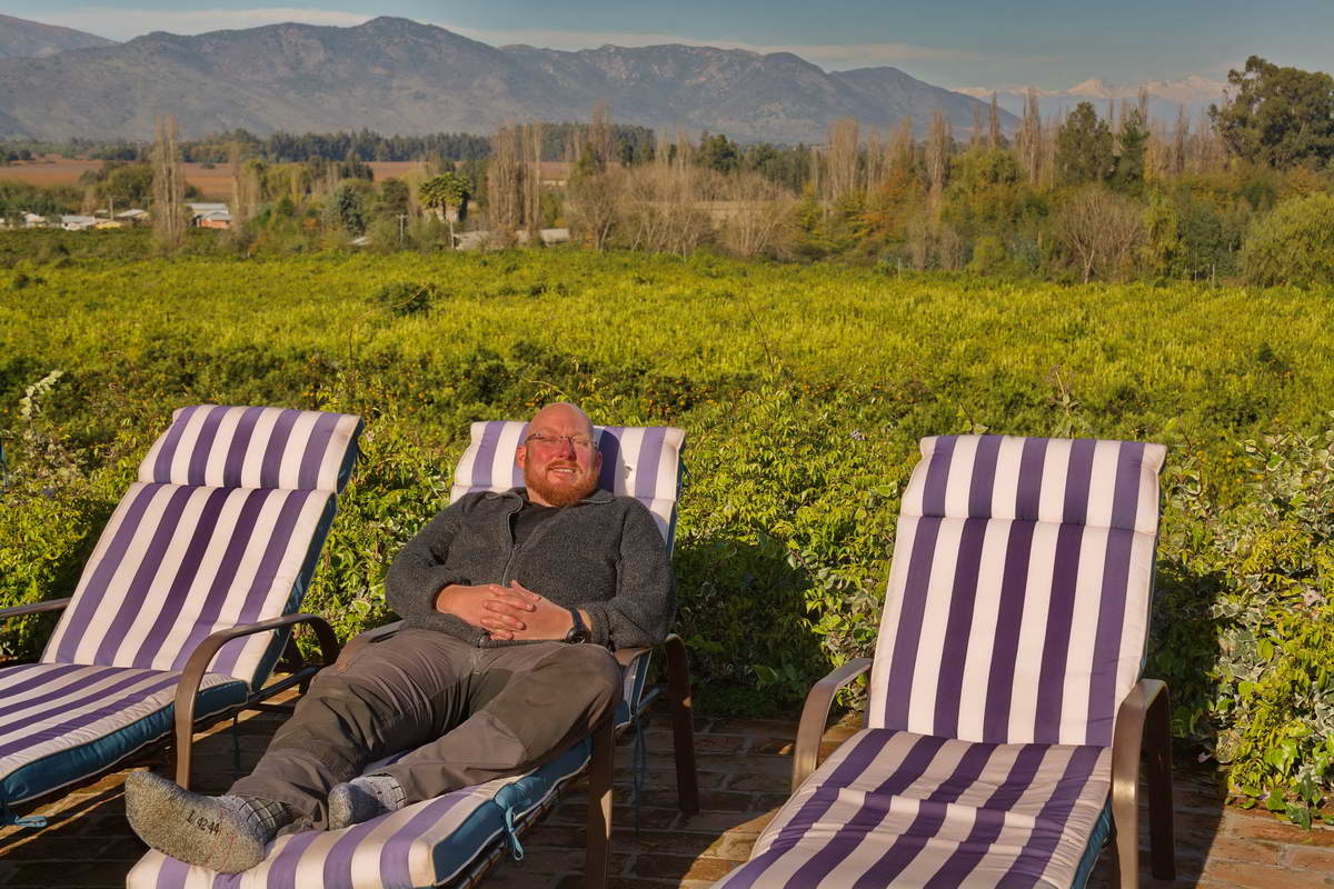 150 Kilometer südlich von Santiago bot sich dazu noch an, Patricio zu besuchen, ebenfalls langjähriger Landrover-Freund. Er betreibt in Santa Cruz die angesagte Bar 179 und außerhalb inmitten von Weingärten und Zitrusfruchtplantagen ein kleines Hotel, das Colchagua Camp. Idyllisch angelegt in den Hügeln, hat er Kuppelzelte auf Holzplattformen errichtet, viel privater Raum, dazu ein Wasser gefüllter Holzzuber, der mit einem Holzofen beheizt werden kann. Abends ein Gläschen Wein unter Sternenhimmel im warmen Wasser, gemütlich. Er lud mich ein, hier zu übernachten, was ich gerne dankend annahm.