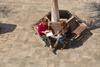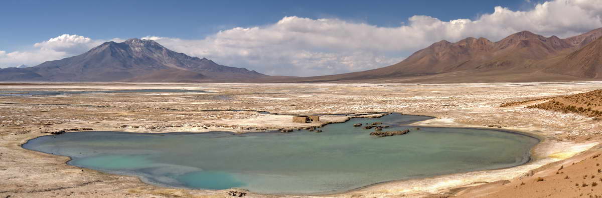 Ich verließ die 4300 m hoch gelegen Lagune Richtung Süden, nächster Punkt war der Park um den nach wie vor aktiven Vulkan Isluga, 5550m hoch. Nach einem Lunchstopp an der Laguna Arabilla mit Blick auf den Vulkan suchte ich eine kleine Therme auf, einfach genannt aguas calientes – heißes Wasser. Leider war es nicht ganz so heiß wie erwartet, aber um mir den Schwefelgeruch abzuwaschen, der mir immer noch nachhing, reichte das Wasser aus. Die Einheimischen nutzen den warmen Teich ebenfalls um sich zu waschen und auch für deren Wäsche – Schonwaschgang bei 30 Grad. Die gesamte Familie half zusammen, den ganzen Tag schrubbten sie Hosen, Kleider und Decken, die Oma grillte derweilen ein Lamm mit Kartoffeln über dem offenen Feuer, die kleinen Geschwister des Lamms durften auch mit auf den Ausflug, bekamen vollste Zuneigung und wurden mit der Flasche gefüttert. Die müssen ja auch noch kräftig wachsen – bis zum nächsten Wäsche waschen. So ist halt der Kreislauf hier. Das Leben ist karg.