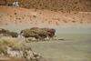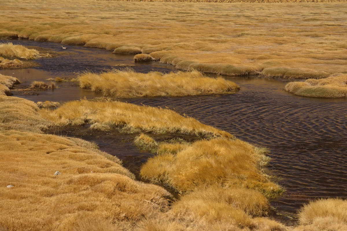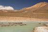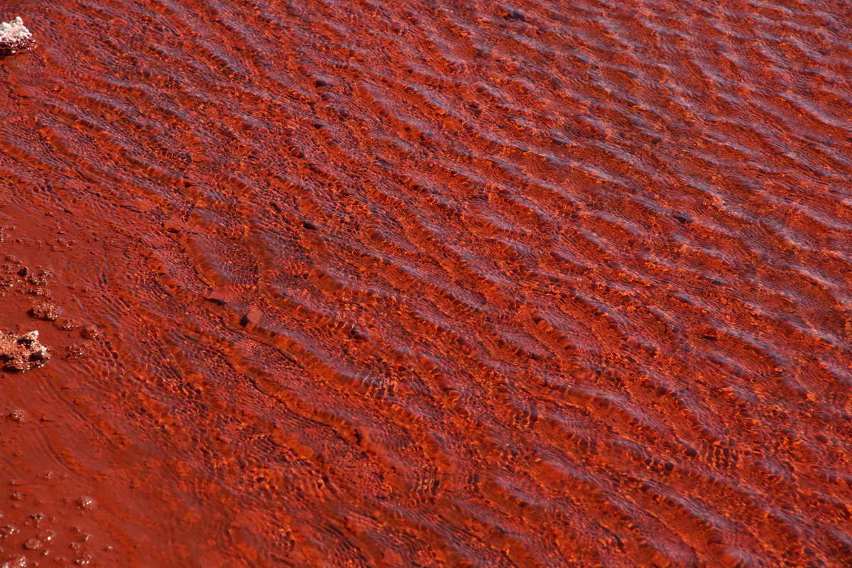 Vom Parkplatz trennte mich nur mehr ein kleiner Fluss von der auf 3550 m hoch gelegenen Lagune. Augenscheinlich konnte ich keinen Zulauf zu dem Gewässer entdecken, nur einen Ablauf, das rote Wasser soll durch Mineralien die intensive Farbe erhalten, ob es giftig ist weiß ich nicht mit Sicherheit, aufgefallen ist mir, dass während meines Besuches weder Flamingos, die sonst an jeder Pfütze hier in der Puna zu finden sind, noch andere Vögel im Umfeld des Sees zu finden waren.