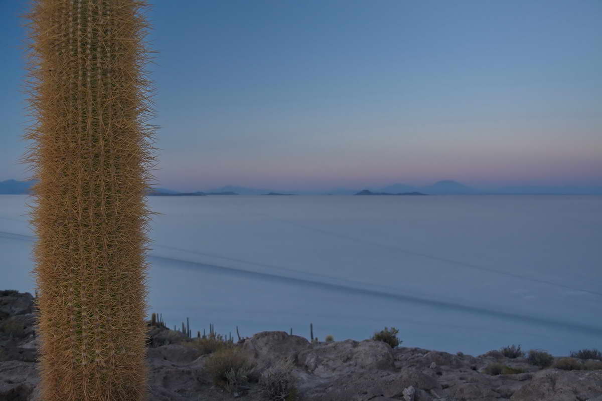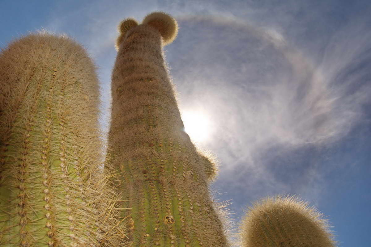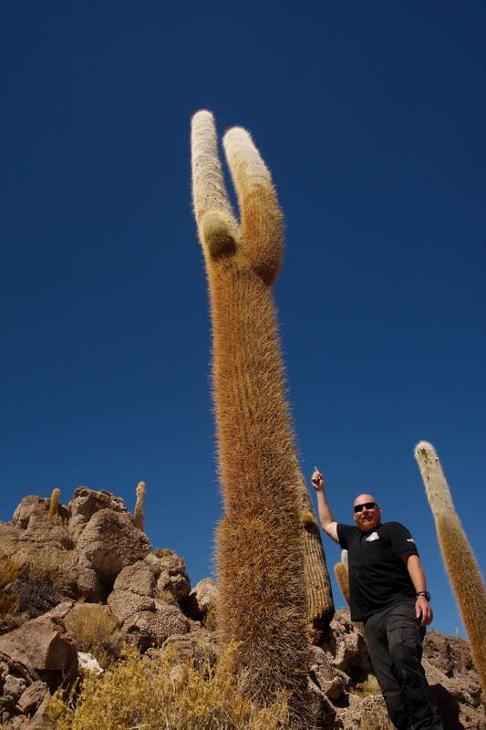 Inmitten dieser leblosen Salzwüste erheben sich einige Felsinseln, teilweise über 100 m aus dem Salar. Langsam wuchsen hier riesige bis zu 12 Meter hohe Kandelaber Kakteen aus dem steinigen Untergrund, teilweise so dick, dass man sie nicht mehr umgreifen kann.