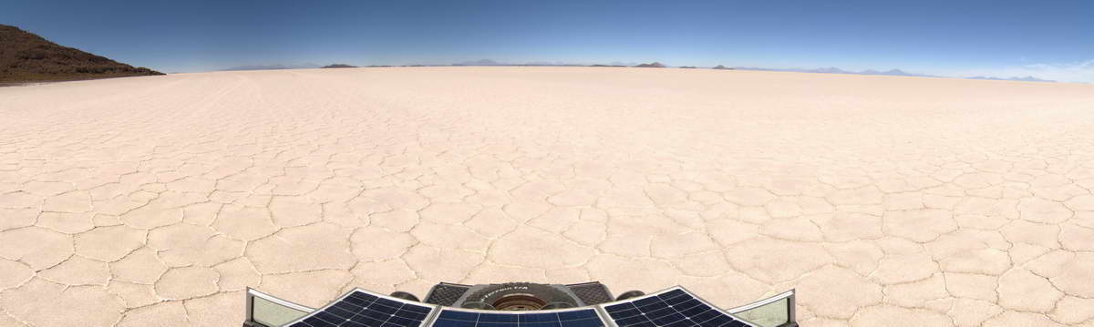 Und jetzt berührten die Räder tatsächlich die weiße, harte Salzkruste. Ich stand auf dieser unglaublich großen Fläche, mit fast 11000 Quadratkilometer so groß wie Oberösterreich, das Weiß dieser größten Salzfläche der Welt blendete in den Augen, ohne Sonnenbrille geht hier nichts. Diese weiße Ebene, die sich bis zum Horizont und darüber hinaus erstreckt, hat etwas Magisches, Faszinierendes. Ich kann es nicht beschreiben, das muss man erlebt haben, ich fühlte hier eine überwältigende, erhabene Stimmung. Langsam bewegte ich mich vorwärts, genoss jeden Meter.