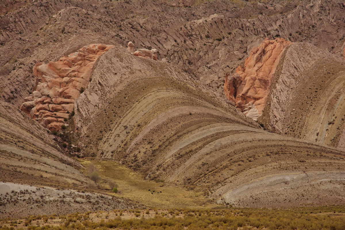 Einige Salzseen wechseln sich mit bunten Lagunen, die Farbe des Gesteins ändert sich regelmäßig, Kegel wachsen aus dem Boden, wie Miniaturvulkane, das Pampasgras leuchtet in besonders intensiven Orange und Gelbtönen. Aus sandigem Boden erheben sich plötzlich mehreckige Gesteinssäulen, regelmäßig geformt, vulkanischen Ursprungs. Eine Berge setzen sich aus so vielen verschiedenen Gesteinen zusammen, dass man die unterschiedlichen Farben gar nicht zählen kann. Teile des Gebiets stehen unter dem Status ein Naturschutzgebiet zu sein, bekannt unter dem Namen Reserva Nacional Los Flamencos.
