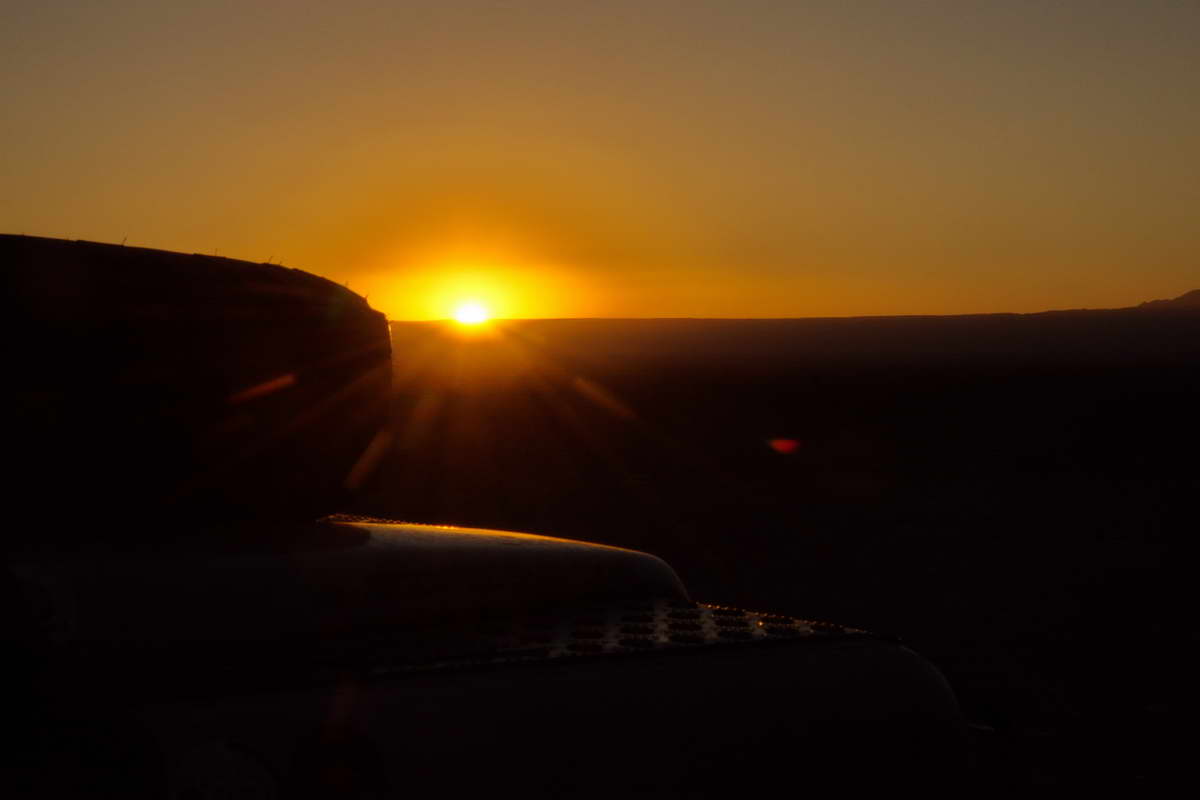 Dem Spaziergang entlang der Lagune endete in einem ausgiebigen Bad in dem schwefelhaltigen Wasser. Den fauligen Geruch hatte ich anschließend noch 3 Tage in der Nase. Den sehr windigen Abend verbrachten wir gemeinsam in Lutz Toyota, der bot mehr Sitzgelegenheit als mein Landy. Die Nacht wurde bitterkalt, das Thermometer zeigte zum Morgengrauen knapp minus 10 Grad an, die Fenster waren dick mit Eis bedeckt. Mühsam schälte ich mich aus dem Schlafsack, es war ein Gewaltakt, dem wärmenden Schlafsack zu entsteigen, aber der Sonnenaufgang wollte genossen werden. Das mit 70 Grad aus dem Boden sprudelnde Wasser kondensierte mit der saukalten Luft und stieg als Dampfwolke über 30 Meter in den Himmel, langsam schob sich die Sonne über den uns gegenüberliegenden Bergkamm und ließ den Schatten immer weiter zurückweichen. Als uns die ersten Sonnenstrahlen erreichten, konnten wir die Wärme sofort fühlen. Eine halbe Stunde später war es bereits angenehm warm und die klammen Finger tauten auf. Bevor wir uns verabschiedeten und die beiden Richtung Bolivien aufbrachen, gönnten wir uns ein gemeinsames Frühstück mit Spiegeleiern, Salami und allem was man in dieser Höhe so braucht um wieder zu Kräften zu kommen.