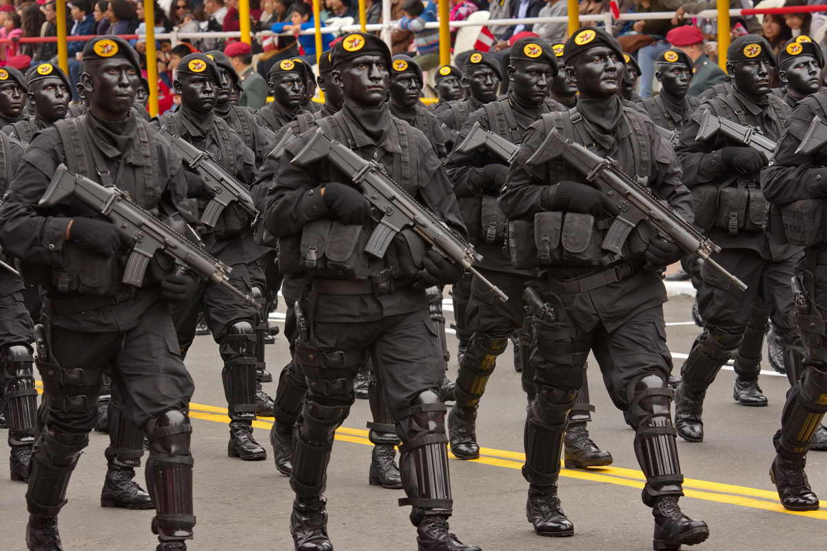 Um 9.30 begann die Parade, abwechselnd in historischen Uniformen und modernen Kampfanzügen, bewaffnet mit unterschiedlichstem Gerät, marschierte eine der am besten bewaffneten Armeen Süd- und Zentralamerikas die nächsten 6 Stunden lang an mir vorbei. Abenteuerlich wirkten dabei vor allem spezielle Kampfeinheiten, die komplett schwarz geschminkt waren oder auch Einheiten, die eher wie Guerilla Einheiten wirkten, sehr martialisch aussehend mit ihren Totenkopf Schals auf ihren Köpfen.