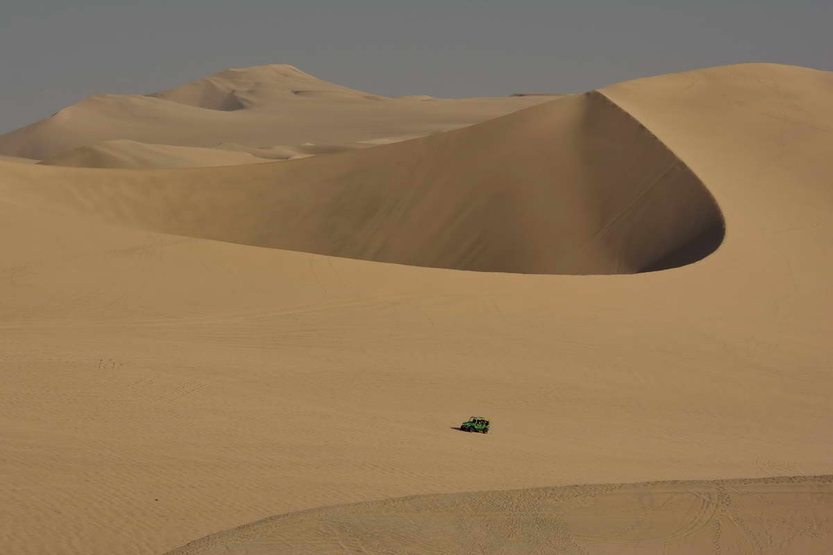 Jedoch kribbelt es bei mir schon, wenn ich das Starten der großvolumigen, amerikanischen V8 Motoren höre, diesen tiefen, kraftvollen Sound, der mit jedem Gasstoß aus den kurzen, ungedämpften Auspuffrohren dröhnt, das ist einfach geil. Unablässig ist den ganzen Tag der Geräuschpegel hoch, da die selbstgebauten Dünenbuggys, die auf einem alten Geländewagenchassis basieren, mit eben jenen V8 ausgestattet und zur Sicherheit mit einem Gitterrohrkäfig umbaut sind, quasi im Minutentakt die Oase verlassen, hinein in Südamerikas höchste Dünenlandschaft.