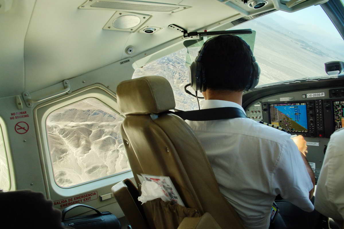 Das ist zwar nicht billig, 90 Dollar musste ich löhnen, dazu die Flughafensteuer. 30 Minuten sollte der Flug dauern. Ich erwischte eine der größeren Maschinen, für 12 Passagiere, aber jeder hatte einen Fensterplatz. Im Slalom kurvte der Pilot mit der Maschine zwischen den Figuren umher, erst rechts, dann links rum, damit beide Seiten einen guten Blick hatten. Der Beobachtungszeitraum war somit relativ kurz, ein paar Sekunden mussten genügen um die Figuren im Gewirr der sonstigen, zahlreichen Linien zu entdecken, mit der Kamera anzuvisieren und zu fotografieren, für eine weitere natürliche Betrachtung blieb da fast keine Zeit mehr. Eigentlich müsste man 2 Mal fliegen, einmal mit und einmal ohne Kamera. Die anderen Nasca Lines sind oft so dominant, das die Figuren, weswegen man eigentlich fliegt, ob deren Größe oft trotzdem klein wirken, oder sich schlecht vom Untergrund abheben. Da die Figuren nicht tief, also wenig dreidimensional sind, bilden sich wenig Schatten, je nach Sonnenstand und Trübe der Luft, sind sie mehr oder weniger gut zu erkennen. Generell sollte anscheinend die Morgenluft am besten sein. Für mich persönlich eher enttäuschend und beim Verlassen des Flugzeuges war ich kurz vor dem Kotzen. Die Slalomfliegerei ist nix für Menschen mit schlechtem Magen.