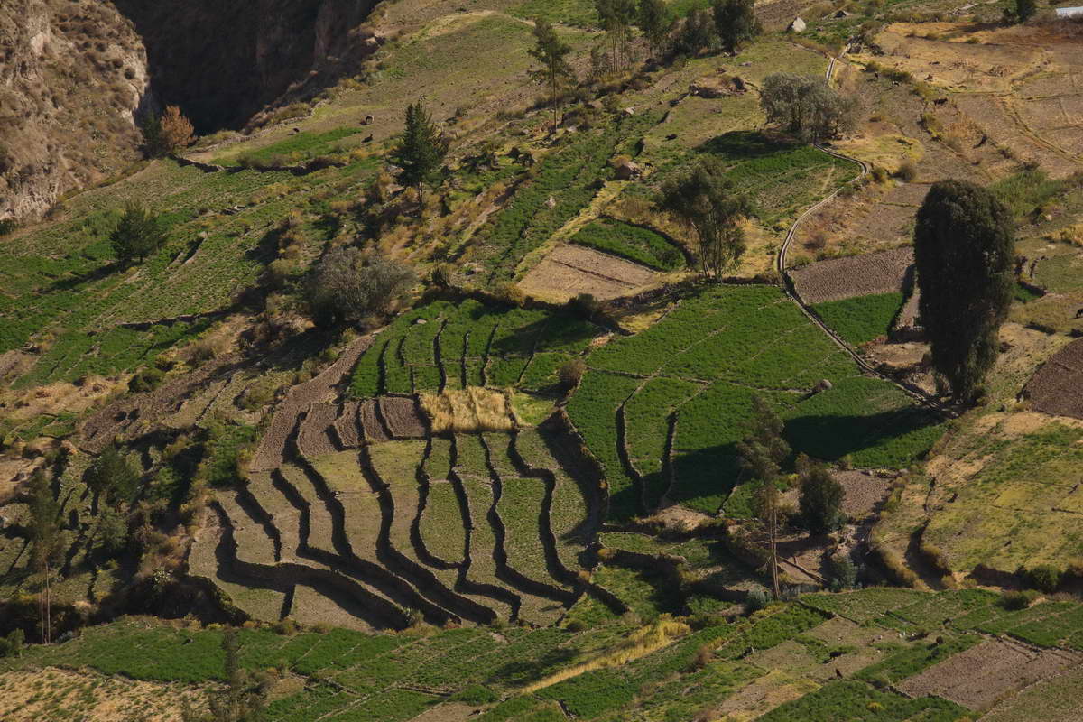 Die Alte führt eng, steil und extrem staubig nach unten, durch alle Ritzen drang der Zementfeine weiße Staub in den Landy. Am Aussichtspunkt Mirador Balneario Condor können die riesigen Vögel beobachtet werden, allerdings ließ sich keiner Blicken. Während der gesamten Abfahrt schweift der Blick durch das Tal mit den vielen landwirtschaftlichen Terrassenfeldern. Die verlief über ein Seitental durch den Ort Tora, ich erreichte das Haupt Tal (2000 bis 2500 m) am Spätnachmittag, die Sonne versank gerade hinter den Berggipfeln und tauche den Canyon in ein oranges Farbenspiel. Eine Genuss Fahrt durch die steile, farbenprächtige Schlucht, genau zur perfekten Tageszeit.