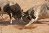 Der erste Kampf: Die Besitzer führten ihre Stiere jeweils am gegenüber liegenden Eingang in die Arena, in der Mitte trafen sie zusammen. Die Stiere wurden genau gegenüber platziert, die Stricke von den Hörnern gelöst. Die Kampfrichter besichtigen die Stiere und warten bis diese loslegten und aufeinander zu donnerten. Dies erwies sich oft als langwieriges und auch langweiliges Unterfangen, denn die Stiere waren erst nicht motiviert. Irgendwann rappelte es bei einem und er ging in den Angriff über, die Schädel krachten aufeinander und dann standen sie wieder ohne Regung da.